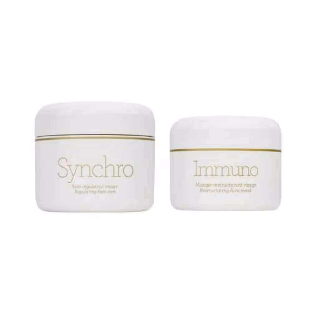 Descubre el pack dúo que combina la eficacia de la crema Synchro, la mejor crema nutritiva, con la mascarilla Immuno, regeneradora del rostro. Este tratamiento es un potente aliado antiedad, detoxificante y alisante, ideal para restaurar el rostro y combatir problemas como manchas o acné.